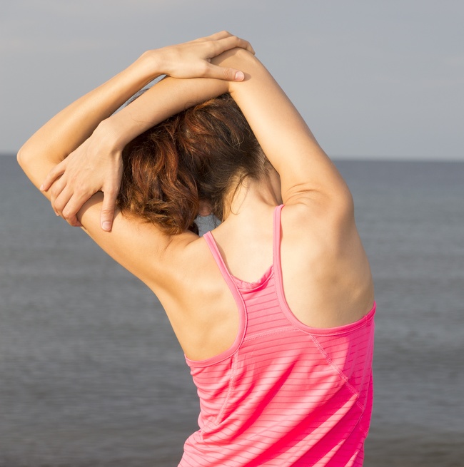 Stehen Sie mit den Füßen auseinander und strecken Sie die Arme nach oben. Beugen Sie den linken Ellbogen und halte Sie ihn mit der linken Hand. Ziehen Sie den Ellbogen sanft zu Ihrem Kopf. Halten Sie die Position für 20 Sekunden und wechseln Sie die Arme.