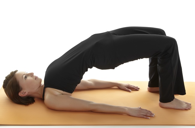 Legen Sie sich auf ihren Rücken. Strecken Sie Ihre Arme neben Ihren Seiten und beugen Sie Ihre Knie um 90 Grad. Heben Sie Ihren Körper langsam nach oben, während Sie den oberen Rücken und die Schultern auf den Boden drücken. Halten Sie die Position für 15 Sekunden.