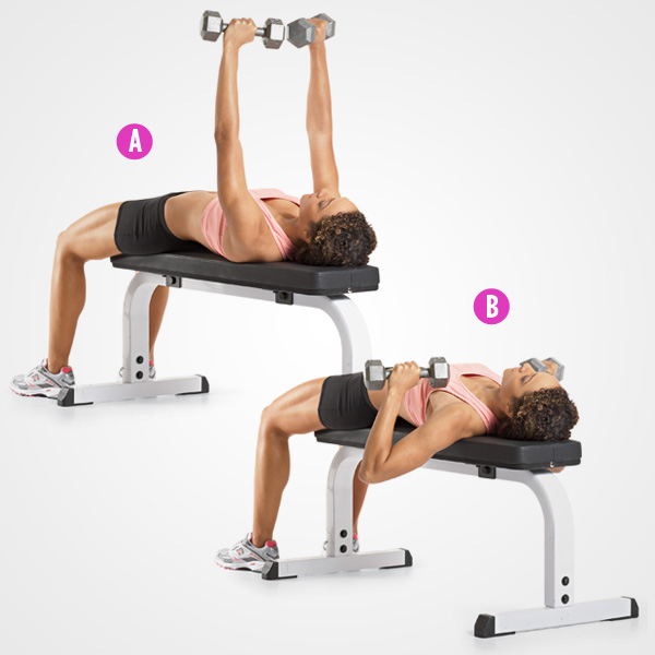 3 Übungen, die hängende Brüste verhindern und rückgängig machen können. Legen Sie sich auf eine Bank mit einer Kurzhantel in jeder Hand. Beginnen Sie, die Hanteln abzusenken, bis sie sich den Seiten Ihrer Brust nähern, und drücken Sie sie dann wieder zurück in die Ausgangsposition. Machen Sie 10 Wiederholungen.